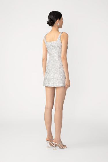 The Aidan Dress is a classic tweed mini with a square neckline and A-line skirt featuring pipa knots tracing the front for a signature finish.