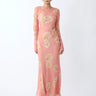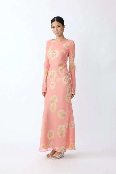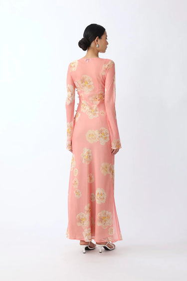 Chiffon maxi dress with long sleeves over a removable slip featuring our signature rose print pattern