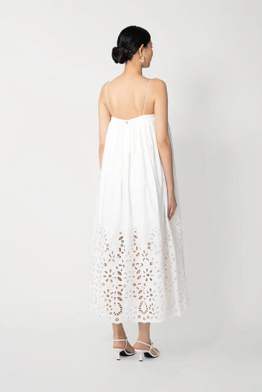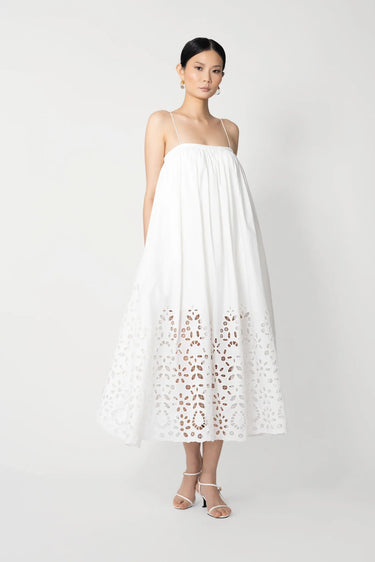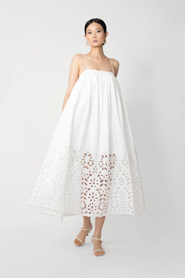 Cotton poplin midi tent sundress with embroidered eyelet detail and scalloped hem