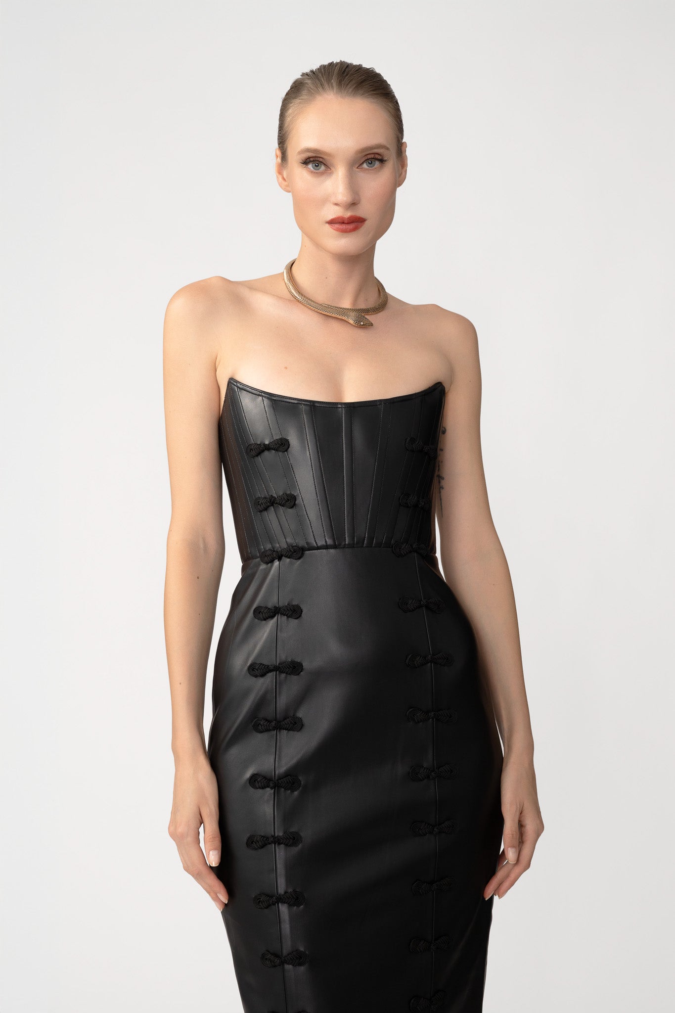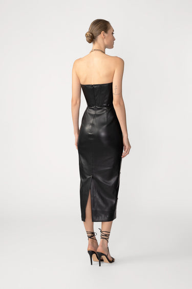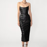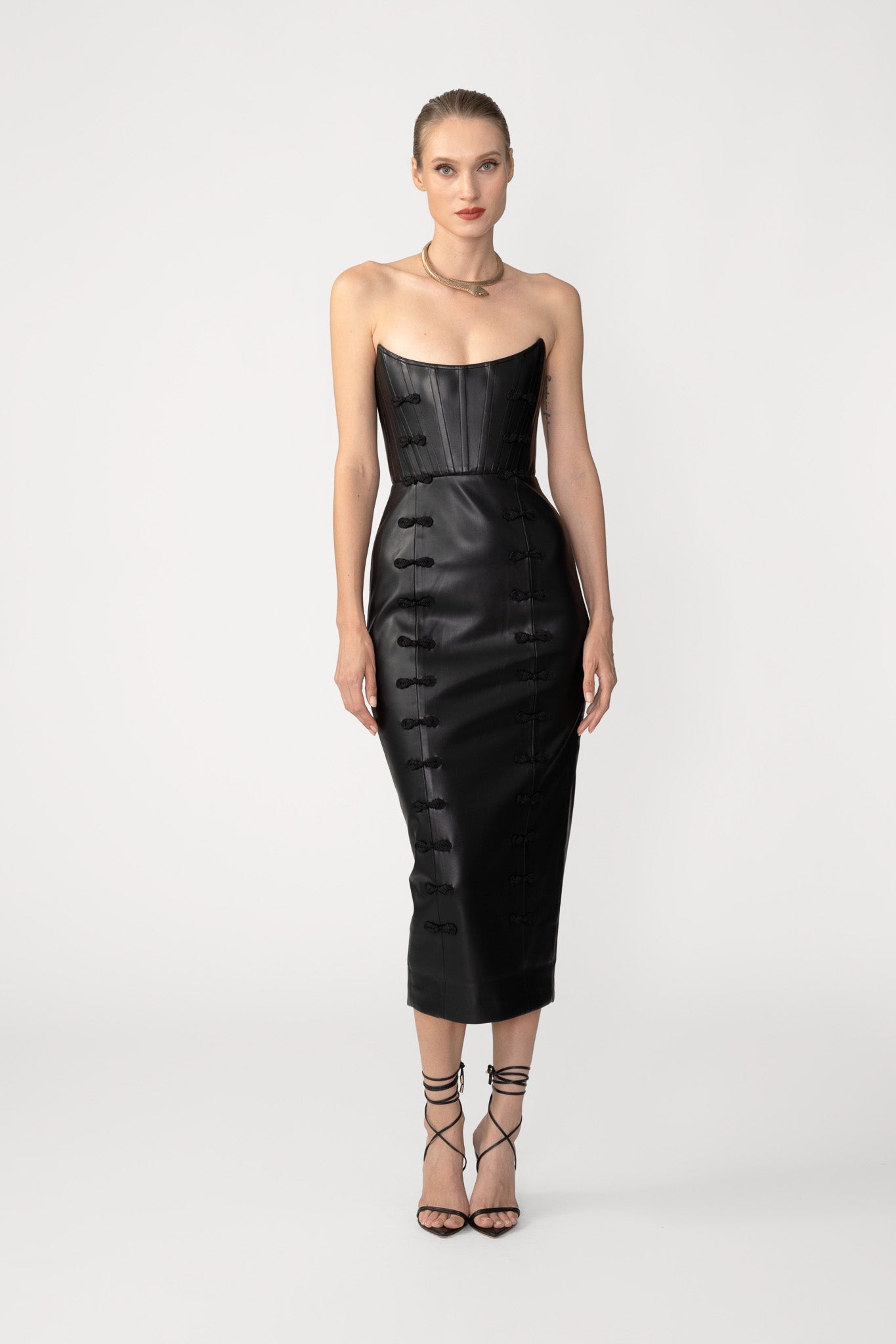 The Juno Dress is a strapless midi column silhouette in faux leather. Designed for a close fit with a sculpted bodice and pipa knots along the front.