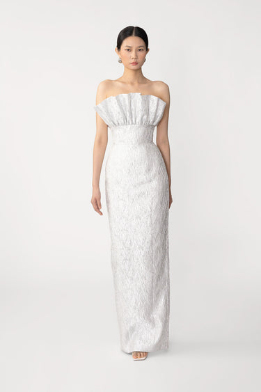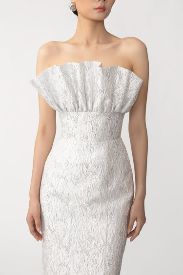 Strapless fitted jacquard gown with a waist panel and internal boning featuring a stiff ruffle detail at the bust