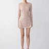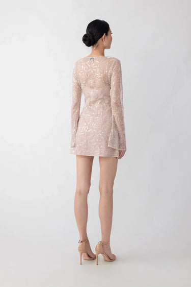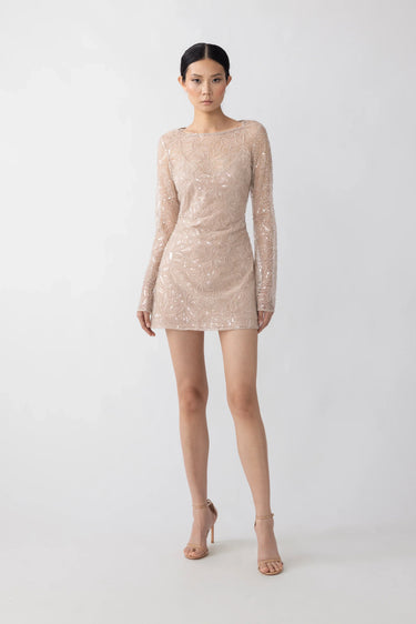 Fully beaded mini dress with bias-cut long sleeves over a detachable slip featuring intricate hand-beaded appliqué