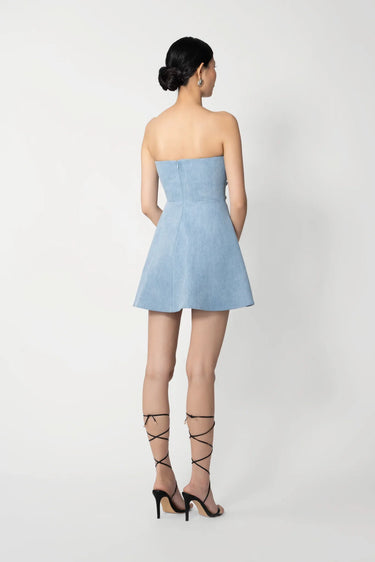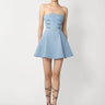 Denim mini fit-and-flare sundress with fully-boned bodice and signature pipa knot detail
