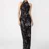 The Arielle Dress is a modern embroidered mesh cheongsam with halter neckline adorned with beading and shimmering sequins in a striking abstract motif. Comes with a slip for full coverage.