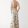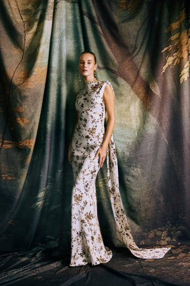 The Callie Gown is a backless statement piece, cut from crepe in a vintage inspired cream floral print. It features a handsewn common-knotted tie that drapes elegantly at the back.