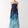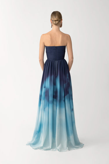 The Camille Dress is a strapless chiffon maxi featuring a pleated bodice and a beautiful original print. Designed with a tailored hem length, it moves effortlessly with you—perfect for outdoor occasions.