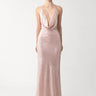 The Claudia Gown is a floor-length silhouette embellished with misty pink sequins. Designed with a halter neckline and plunging front, it’s finished with a concealed zip closure—perfect for a red carpet moment.