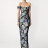 The Jackson Gown is a one-shoulder strap jacquard column gown with a fully-boned corset top featuring a ruched design.