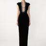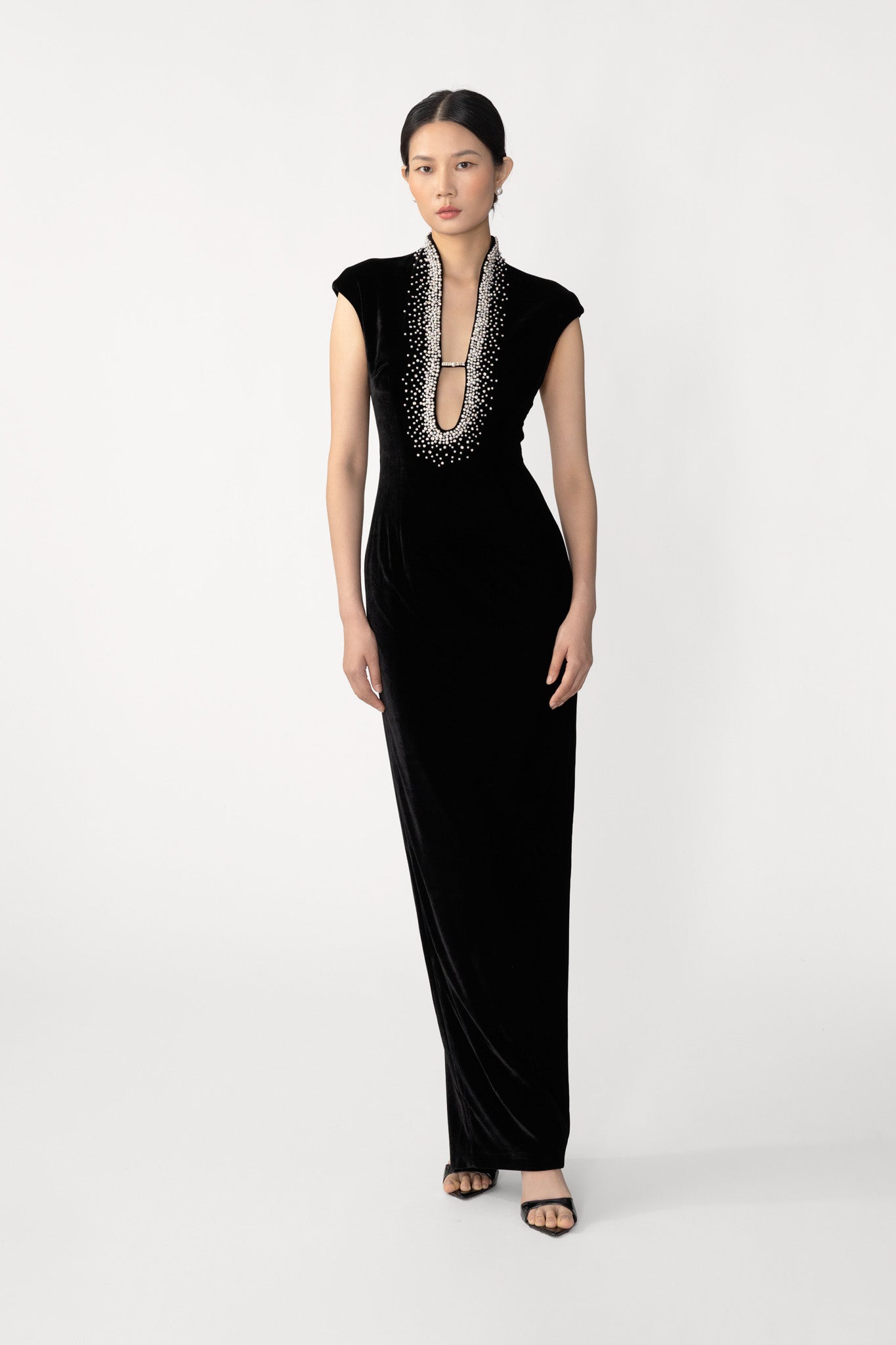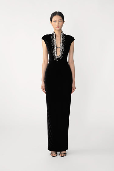 The Lenora Gown is a timeless velvet statement piece featuring a cropped collar with slightly capped shoulders and a full-length pencil skirt that create a modern classic silhouette. A beaded trimmed plunging bust adds an opulent touch for the most luxurious affairs.