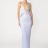 The Luna Gown is a timeless satin pencil gown with a subtly structured bodice featuring a romantic sweetheart neckline and an elaborately embroidered floral appliqué to create an elevated look of luxury.