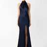 Penelope is our top bestseller that is guaranteed to make you feel effortlessly beautiful and captivating. A stunning bias-cut satin gown featuring a high neck, a low-cut back and open sides, a thigh-high side slit with covered button detail at the hip, and large statement wings at the back of the neck.