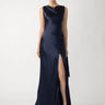 Open-back satin gown in bias-cut fit with shoulder straps and thigh-high slit, featuring enlogated statement wings that drape from each shoulder and decorative buttons that trail along the hip