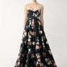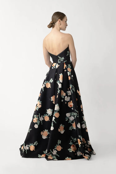 The Tiffany Gown is cut from glossy satin with a sweetheart neckline and a fully boned bodice for a structured look. Crafted in an original print featuring peach and ivory roses, this gown exudes romance and drama.