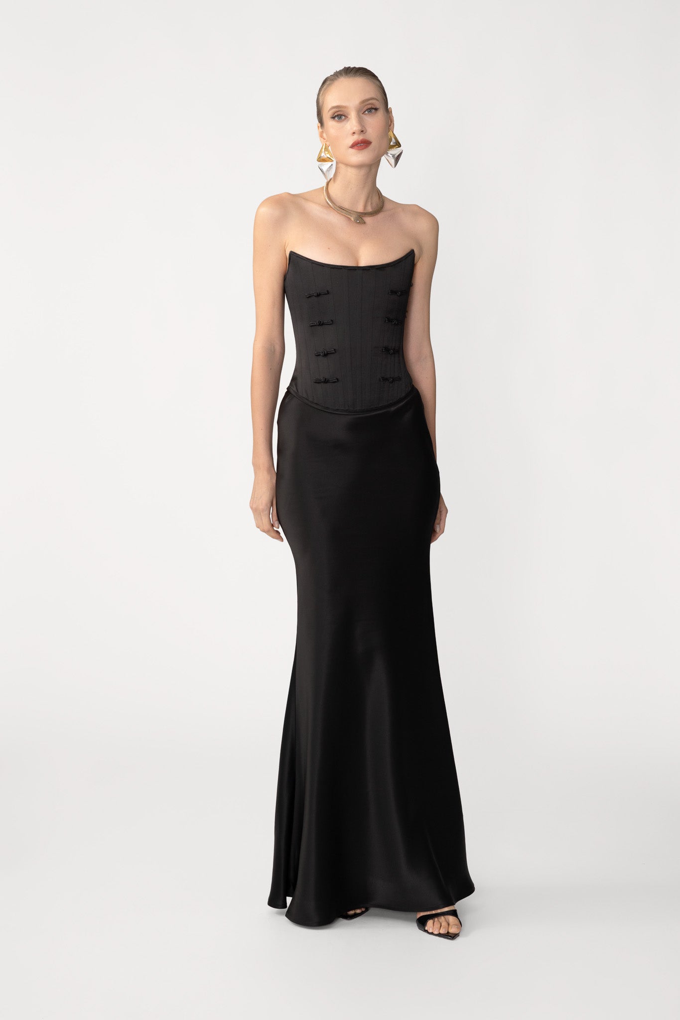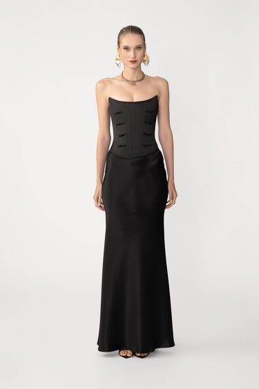 The Della Skirt is a satin maxi cut on the bias for a fluid drape that elongates the frame. An elevated and versatile piece, perfect for special occasions or everyday styling. Pair it with the Della satin corset top for a sensual statement look.