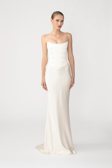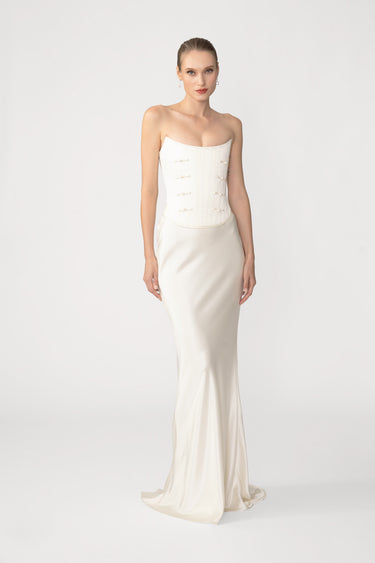 The Dolly Skirt is a classic bias-cut design that elongates the body and drapes fluidly in glossy satin, enhancing natural lines and curves. This piece brings sophisticated, understated elegance with a sensual touch.