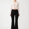 The Drew Pant is a mid-rise, flared-leg pant featuring signature hand-tied pipa knots that trace the front seam of each leg and lead to a bottom open slit. A modern twist on a vintage silhouette, perfect for styling into a versatile everyday look or casual occasion.