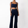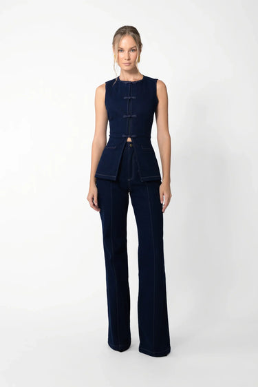 Tailored high-waisted, wide-leg denim pant with slight stretch featuring signature pipa knot detail