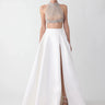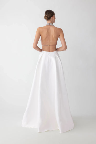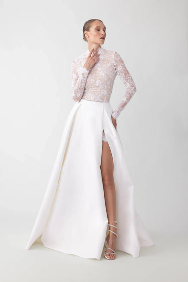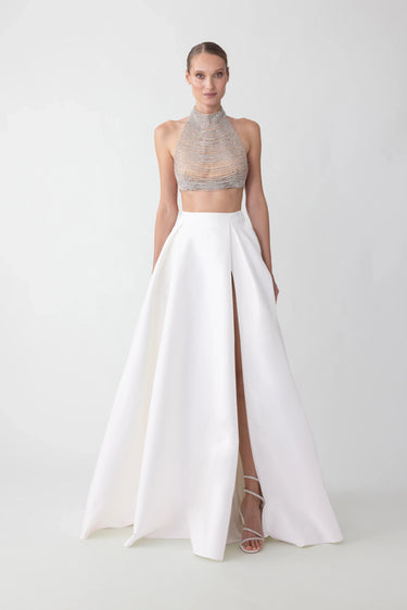 Voluminous duchess satin gala skirt featuring thigh-high slit and hidden pockets