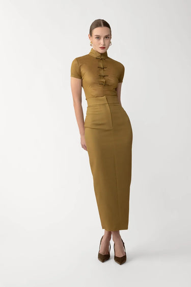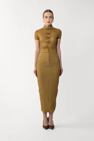 The Niki Skirt is a pencil silhouette in crepe that hugs the body and falls to a clean, streamlined hem. A back slit ensures ease of movement, perfect for everyday styling.