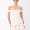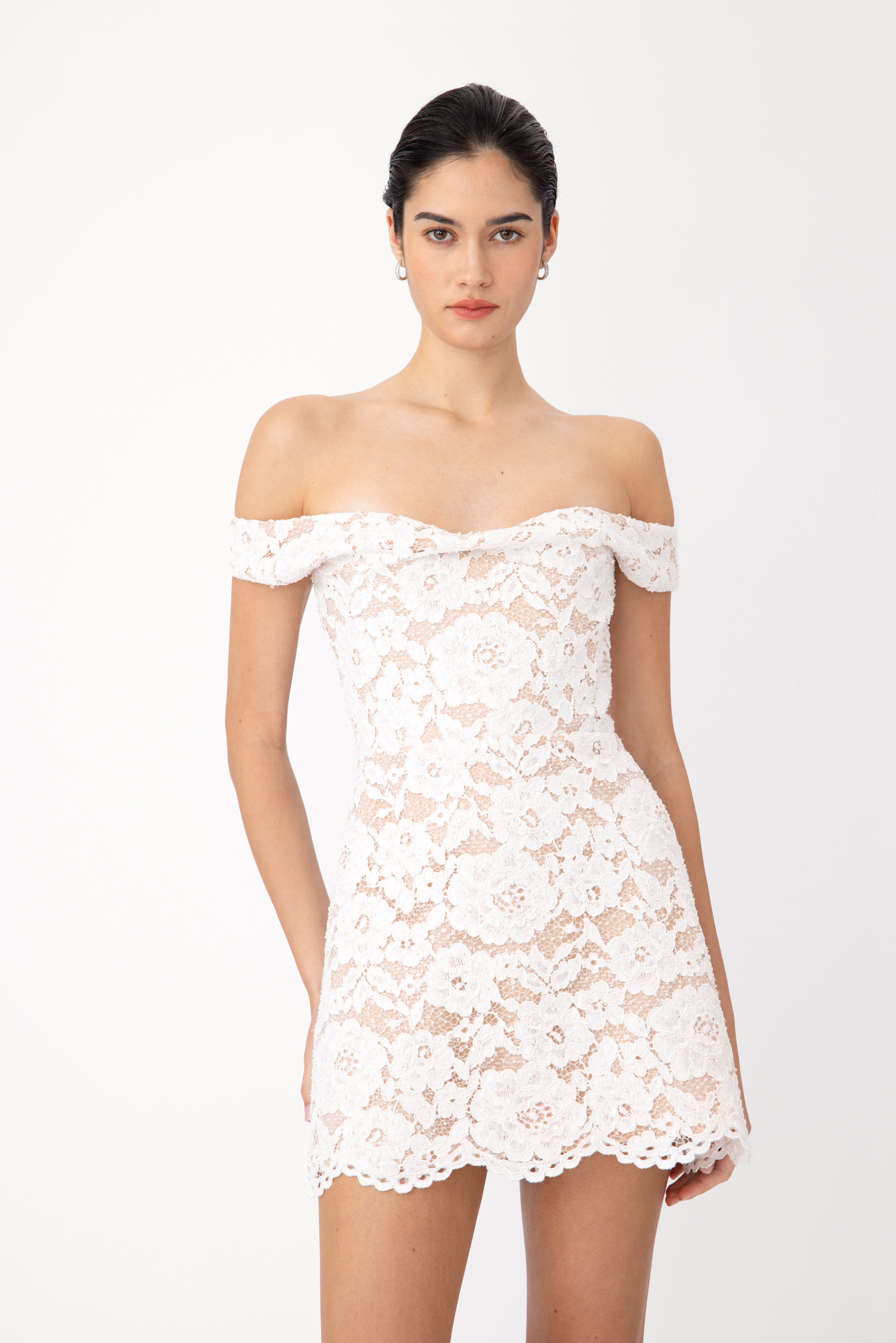 The Daphne lace dress is crafted from bead-embellished corded lace featuring a built-in, structured, corset-style bodice that provides flattering support. A draped, off-the-shoulder neckline adds a touch of allure, while the scalloped lace hem lends a delicate finish.