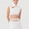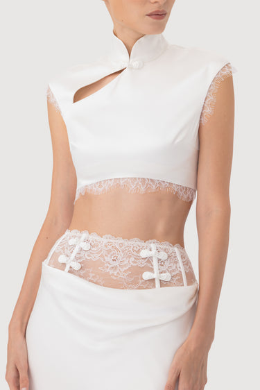 The Lila satin top is crafted from lustrous satin fabric, accented with delicate chantilly lace trim. It features a distinctive cheongsam opening with a mandarin collar for a modern twist, while hand-tied pipa knot details add unique charm to its close-fitting, cropped silhouette. Pair it with the matching Lila satin skirt for a complete look.