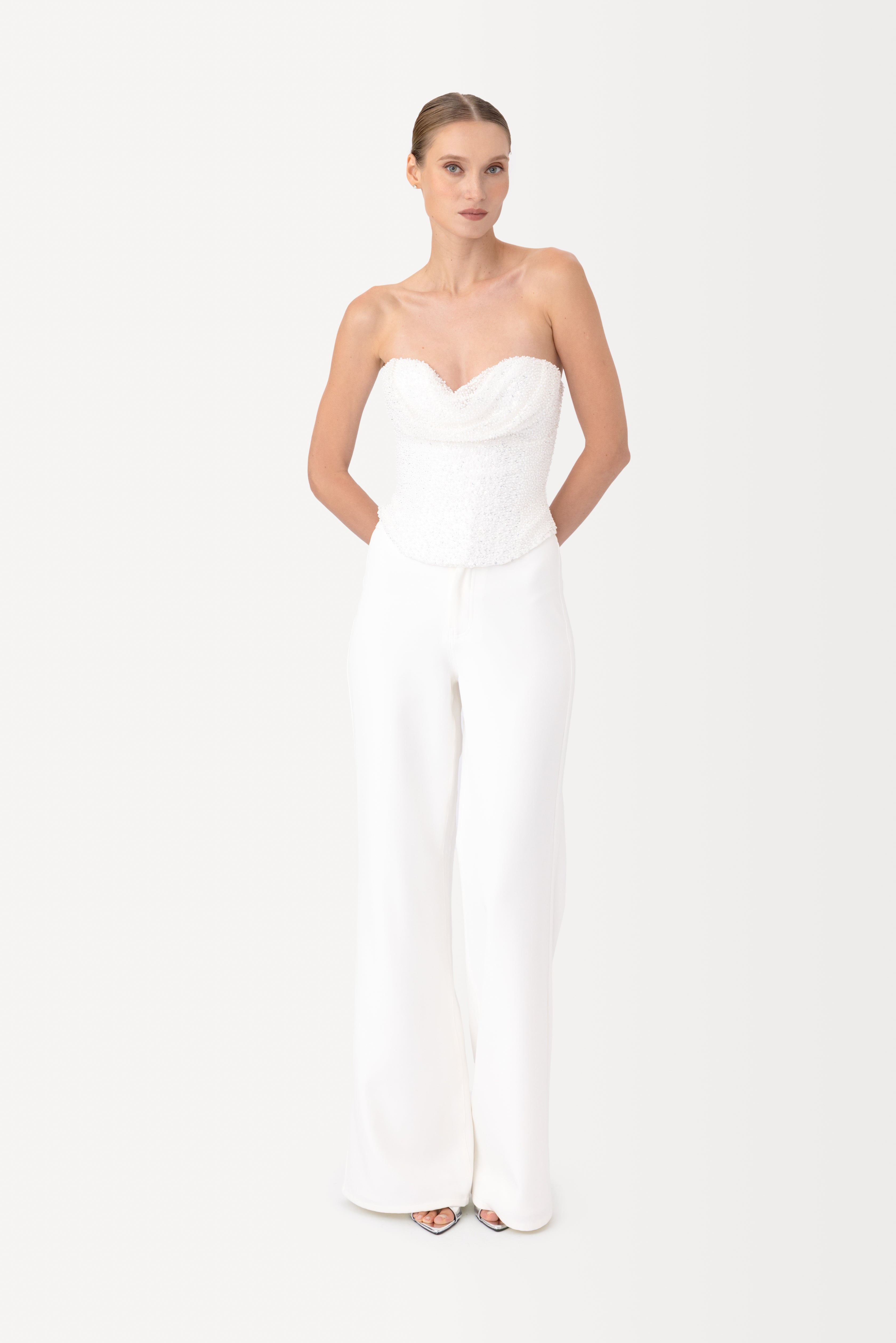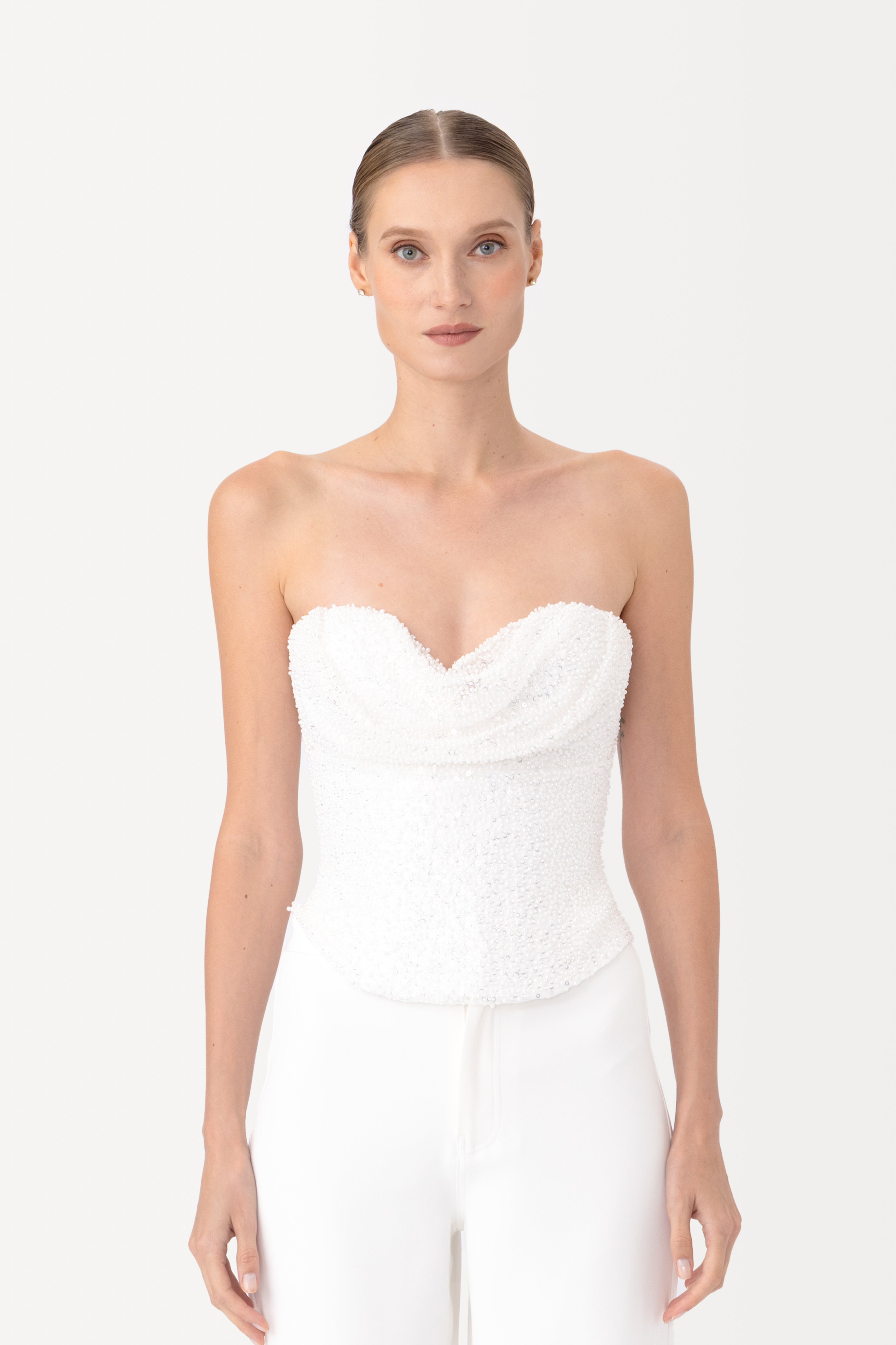 The Lin beaded corset top is crafted from sequin and pearl-beaded fabric. It features a built-in structured corset-style bodice that offers support and shape. The draped sweetheart neckline adds a soft touch, while the exposed zipper provides a modern edge. Perfect for pairing with the Lin crepe pants.