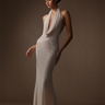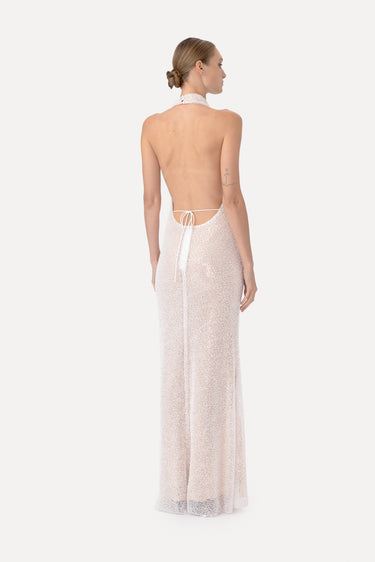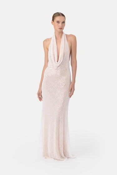 The Lindsay beaded gown is a floor-length piece crafted from sequin and pearl-beaded fabric. It features a beautifully draped cowl halter neck that adds a touch of sophistication, while the open back enhances its allure.