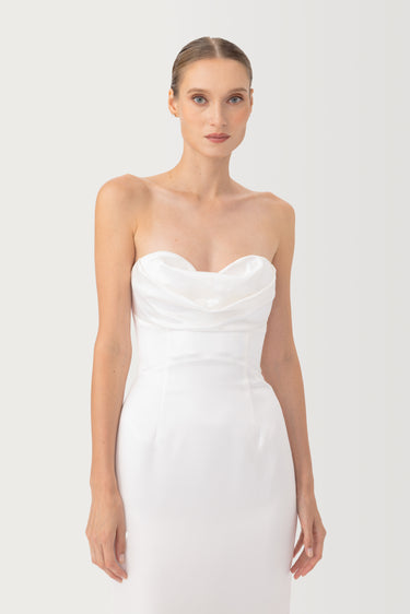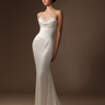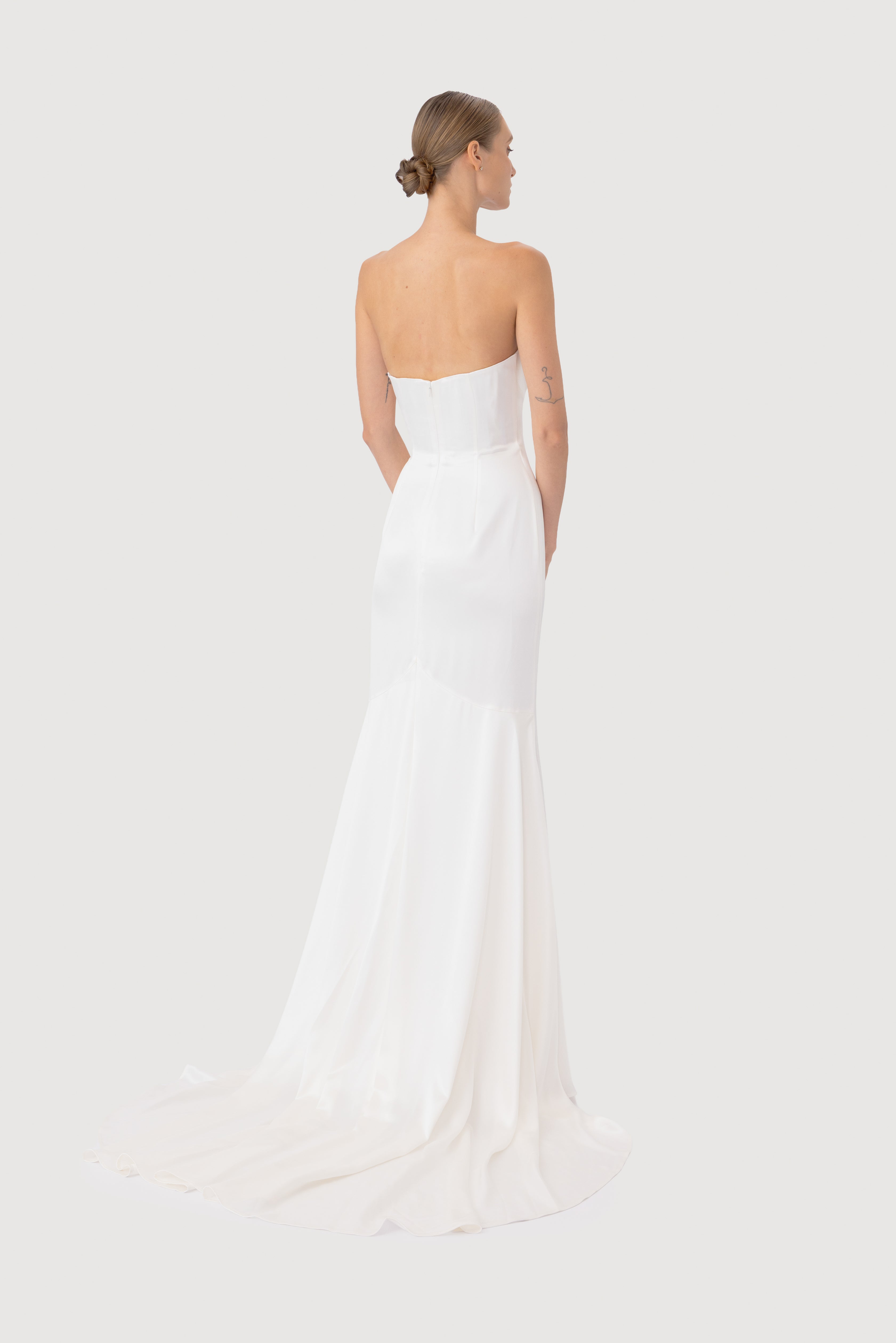 The Rianne satin gown is crafted from fluid satin featuring a figure sculpting corset bodice and romantic sweetheart neckline with a draped bust. The fit-and-flare silhouette extends into a sophisticated trailing skirt.