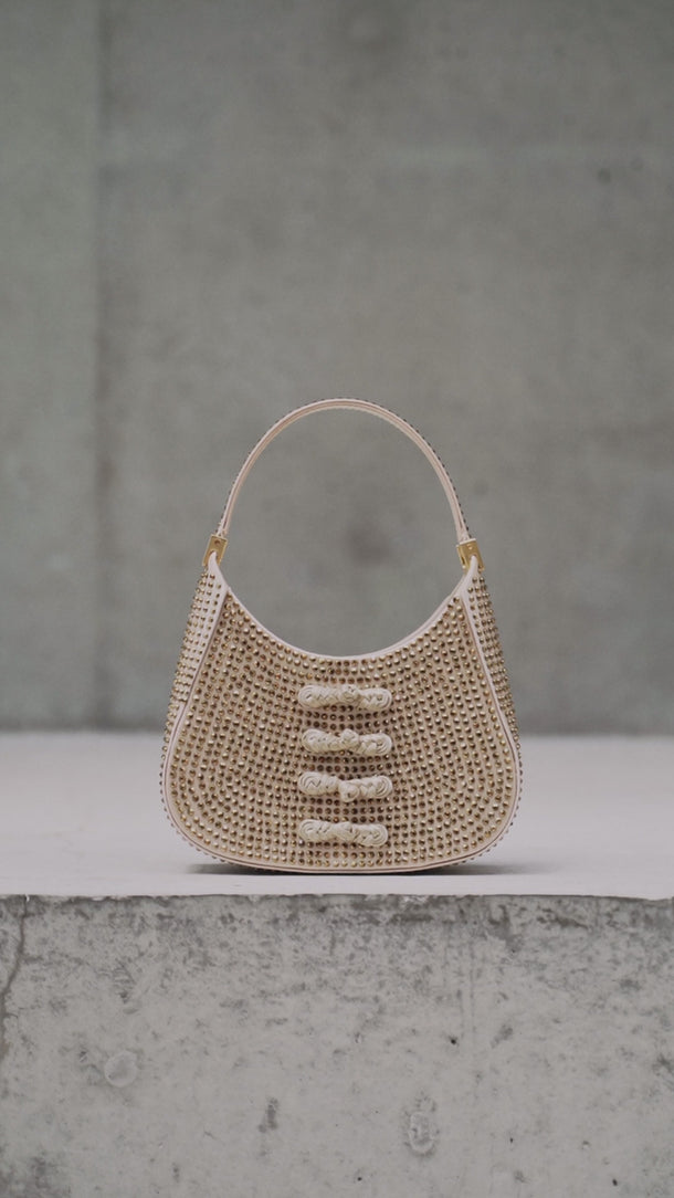 Our pipa-shaped mini bag crafted from deluxe satin with a leather base and handle. Adorned with premium tone-on-tone color crystals and our signature hand-tied pipa knot buttons. Adding that extra bit of sparkle to complete the look. The mini sau is the perfect size to carry what you need while looking chic on any occasion.
