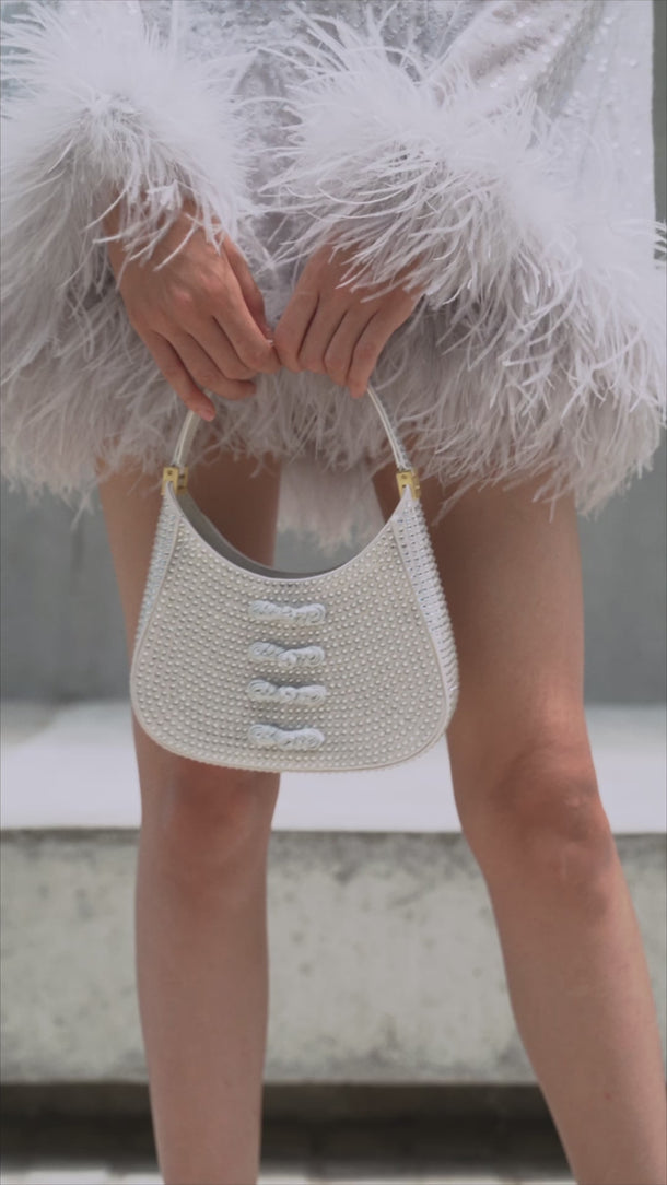 Our pipa-shaped mini bag crafted from deluxe satin with a leather base and handle. Adorned with premium tone-on-tone color crystals and our signature hand-tied pipa knot buttons. Adding that extra bit of sparkle to complete the look. The mini sau is the perfect size to carry what you need while looking chic on any occasion.