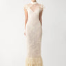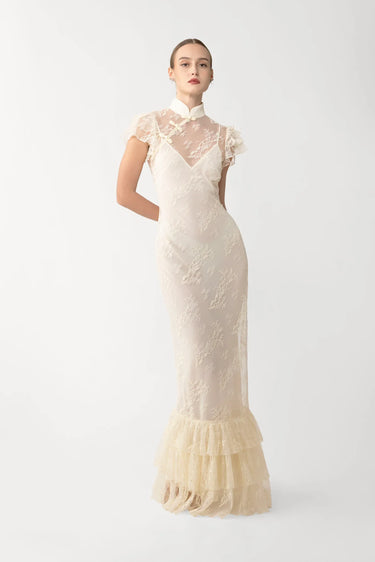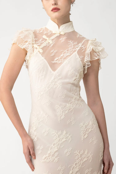 The Ramona Dress is cut from intricate lace with a mandarin collar and ruffled sleeves. Hand-tied pipa knots detail the neckline. Comes with a separable slip dress.