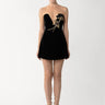 The Aria Mini Dress is crafted in luxurious velvet with a sweetheart neckline centered by a mesh panel. Asymmetrical beaded flowers add texture to the silhouette.