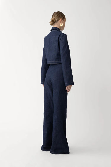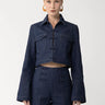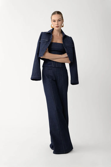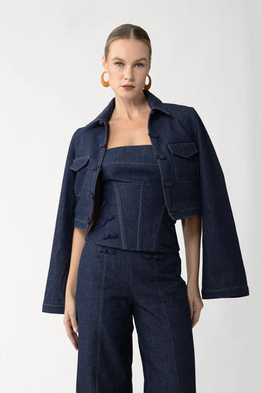 The Bambi Jacket is a cropped denim style with flared sleeves and signature hand-tied pipa knots along the front. An indispensable layer for cooler days.
