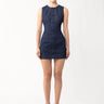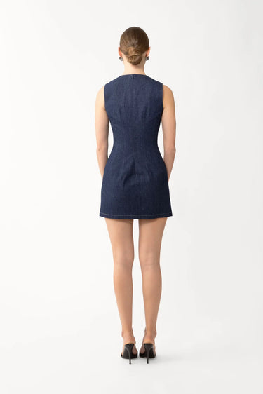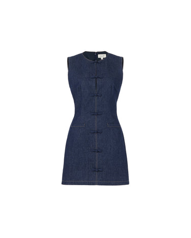 The Billie Mini Dress is crafted in dark denim and cut for a close fit. Finished with hand-tied pipa knots down the center, it’s a refined, modern take on the classic denim dress.