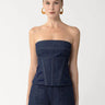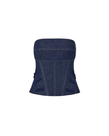 The Brooklyn Top is a strapless denim corset with full boning for sculpted support. Featuring hand-tied pipa knots along the waistline, it’s an elevated wardrobe essential.