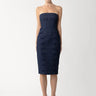 The Brooklyn Dress is a strapless, fitted denim midi style with a fully boned corset bodice. Featuring hand-tied pipa knots that trace the front from the waist down, it’s a signature silhouette with sculpted support.