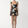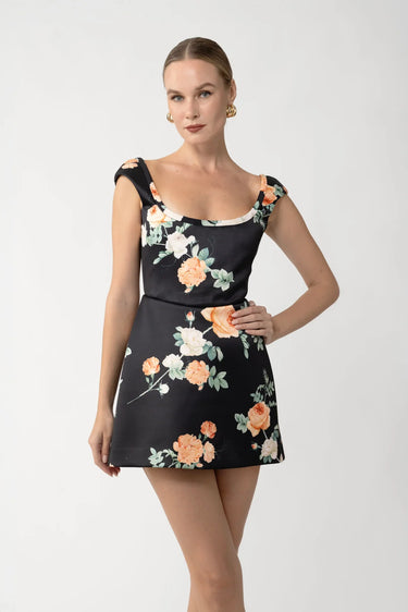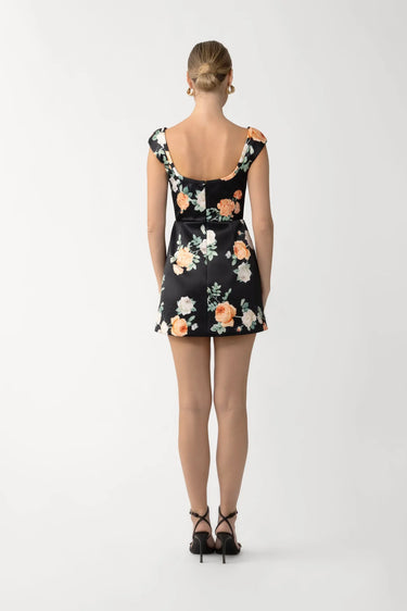 A playful mini dress in luxurious satin, the Bryn Dress features a fully boned bodice and an A-line skirt. Printed in an original peach and ivory rose motif for a romantic touch.