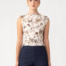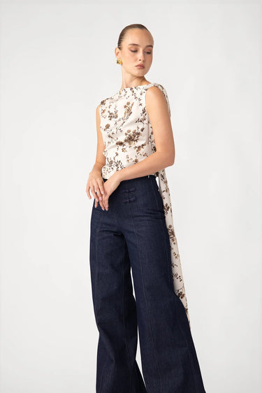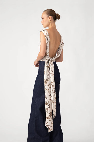 The Callie Top is crafted from crepe and features an open back that drapes elegantly with handsewn common-knotted ties. The close fit and clean lines create a sleek shape, adding a nice contrast to the vintage cream floral print.