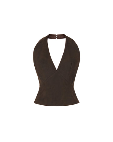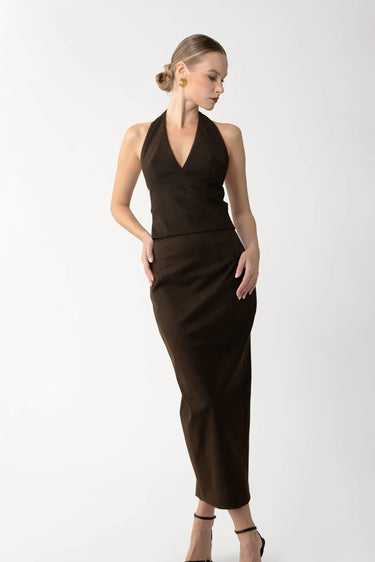The Nomi Top is a halterneck silhouette crafted from faux suede with a slim back strap. Featuring a clean cut and sculpted shape, it’s a sleek choice from day to night—designed to pair with the Nomi Skirt.