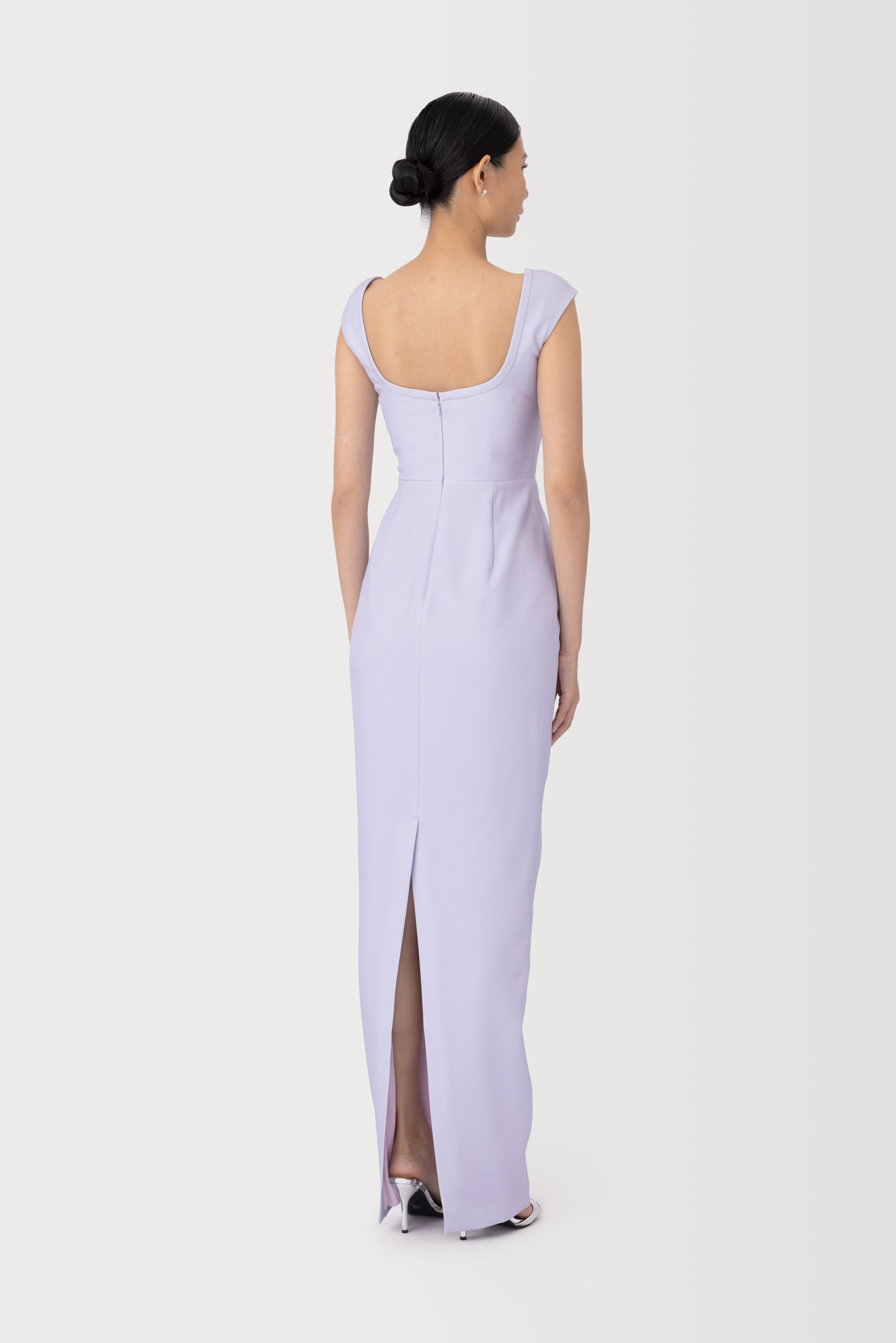 The Brooke gown is a floor-length design in smooth crepe fabric. It features a scoop neckline and a built-in structured corset for a sculpted fit. A front curved waistline defines the silhouette, while a back slit completes the sophisticated look.