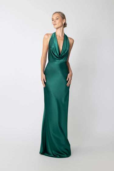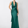 Halter satin gown in bias-cut fit with cowl neckline featuring elongated statement wings that drape from the back of the neck
