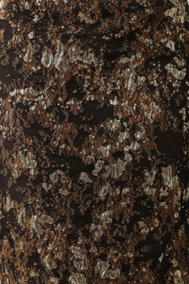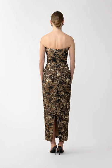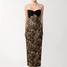 The Jackie Dress is a fitted column dress in black and gold jacquard. Finished with a solid satin black bow for contrast to highlight the bustline.
