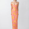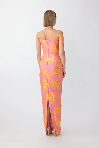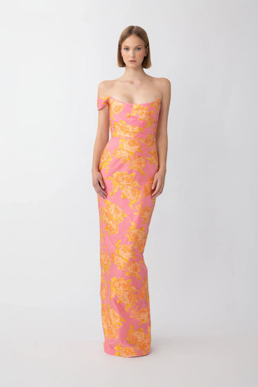 One-shoulder strap jacquard column gown with a fully-boned corset top featuring a ruched design