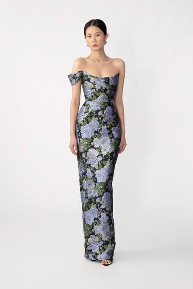 The Jackson Gown is a one-shoulder strap jacquard column gown with a fully-boned corset top featuring a ruched design.