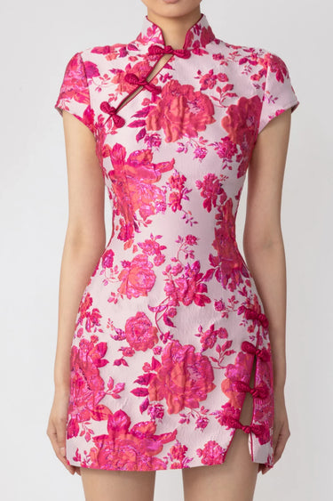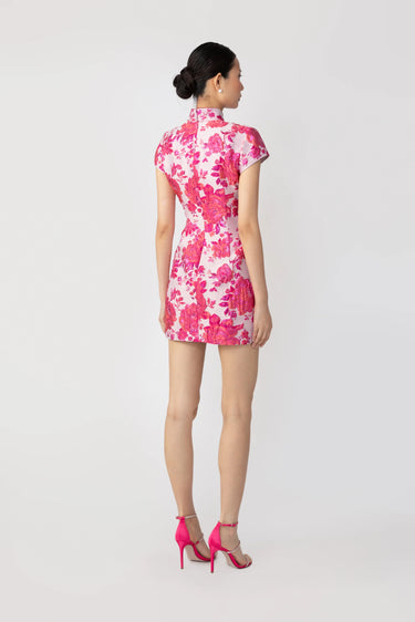 Modern Cheongsam jacquard mini dress with cap sleeves and a Mandarin collar featuring our signature hand-tied pipa knot detail