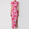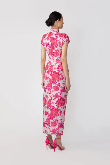 Modern Cheongsam jacquard midi dress with a Mandarin collar and cap sleeves featuring our signature hand-tied pipa knot detail