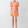 Jacquard mini dress with puffed sleeves and a Mandarin collar featuring our signature hand-tied pipa knot detail