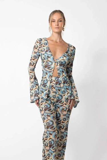 Delphi Coverup Set features a lightweight coverup with flared sleeves and button closure, pair with matching shorts or pant
