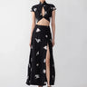 Embroidered satin set with a Chinese top featuring a keyhole cut out and a flowy maxi skirt