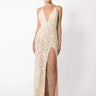 Soft crochet maxi sundress with plunging neckline, exposed back, and high slit featuring special heart-shaped pattern, may be worn over bikini